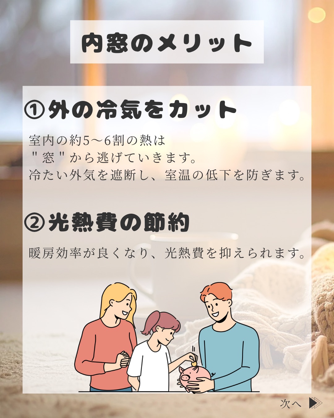 内窓は、冷たい外気をシャットアウトしてお家の暖かさを逃さずにキープします✨